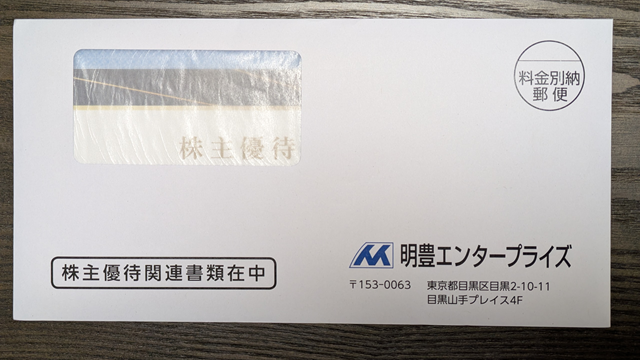 情報有益度 E ★★☆☆☆ F 第1四半期の権利による株主優待が届きました 2026年1月17日 flon_kanimiso かにみそブログ ~かにみそクエスト~ いかがお過ごしでしょうか、かにみそです。 先日、東京都心部で不動産業を営む「明豊エンタープライズ(証券コード∶8927)」より、株主優待が届きました。 優待の内容は、 …