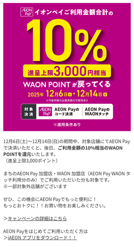 1.イオンペイ利用金額合計の10%がWAON POINTにて還元