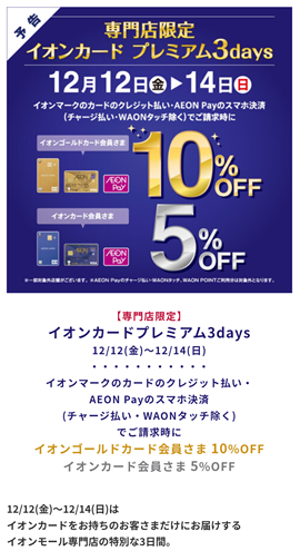 恒例になってきている、イオンモール内の専門店での対象の決済で最大10%OFFになるキャンペーンです。期間は12/12(金)~12/14(日)で、場合によってはAeonPayを利用できる専門店もあるでしょうから、上記と併用できる買い物ができるのが理想です。