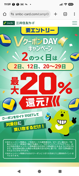 しかし、還元条件を満たさなかった場合(例えばカード現物による決済の場合)、還元率20%に近付けようとしてVクーポンや今キャンペーンの枠が使用されると思われます。