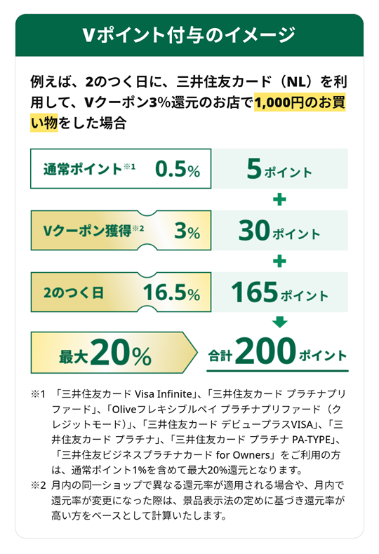 12月から2月までの2のつく日(2日、12日、20~29日。2月末は28日です。)に、Vクーポンを獲得した店舗での買い物(店頭)またはVクーポンのページからオンラインショップへ遷移して買い物(オンライン)をすると、最大20%ポイント還元されます。対象日と対象カード、対象外店舗には気を付けましょう。