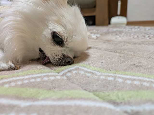 そのまま予防接種当日になり、接種を終え帰宅し愛犬の相手をしようとカーペットに伏せていた愛犬に目をやると‥‥