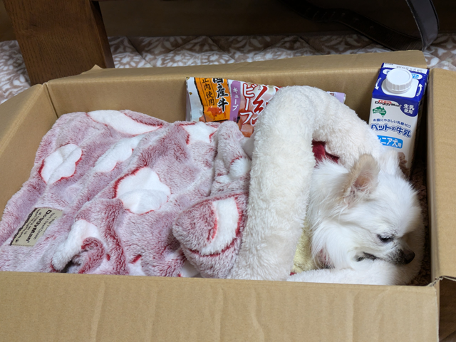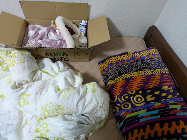そして不謹慎かもですが、亡くなった愛犬を偲びながら、ベッドにて最後の夜をともに過ごしました。(前日は母の寝室で、母とともに過ごしています。)