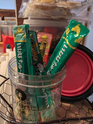さて、それとは別で、当日亡くなる直前に買って開封したばかりの餌(約1か月分)や、ウエルシア薬局で入手した見切り品の「いなばちゅ~る」、トイレマットなどが現在も在庫として虚しく残っています。