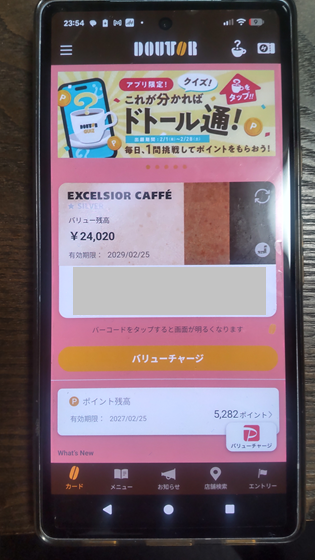 「三井住友カード ゴールド(NL)」の100万円利用ミッション時にチャージしたKOMECAとDVC(ドトールバリューカード)があるので、代替手段として活用します。(代替手段というか、使い切るのに1年以上は要する残高なので、積極的に使いたい。)