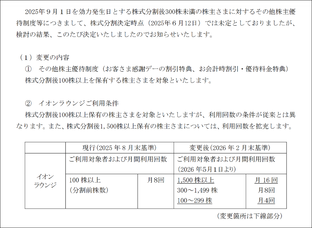 子会社や関連会社への株式交換によるTOBで紆余曲折を経て、昨年9月1日をもって1:3の割合で株式分割を行ったイオン。イオンラウンジの利用に関しては、100株以上300株未満の株主の待遇をどうするのか気になっていましたが、「利用回数に差をつける」というもっともらしい対応。